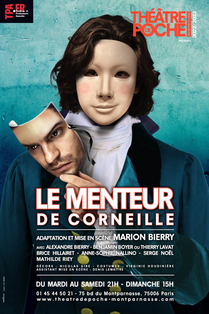 « Le Menteur » de Pierre Corneille, mise en scène de Marion Bierry; avec Alexandre Bierry, Benjamin Boyer (ou Thierry Lavat), Mathilde Rey, Anne-Sophie Nallino, Brice Hillairet et Serge Noël. Au Théâtre de Poche-Montparnasse jusqu’au 9 Avril; du mardi au samedi à 21h et Le dimanche à 15h.