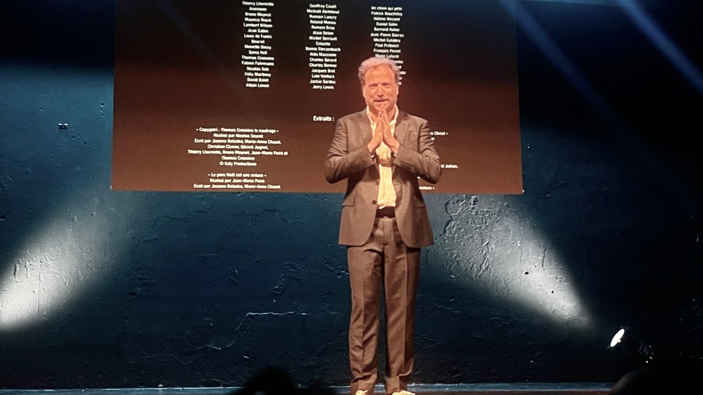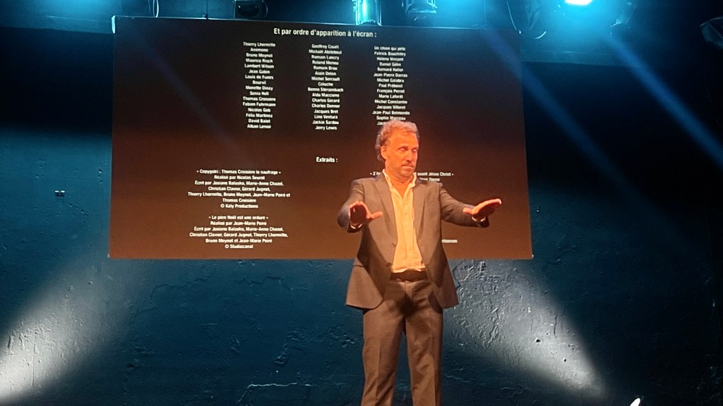 L’Histoire : Dénoncé par CopyGolri pour avoir honteusement copié un film culte; le grand réalisateur/comédien Thomas Croisière doit se justifier lors d’une conférence de presse à ces accusations. Et pour cela; il va faire découvrir son cinéma, ce Cinéma qui a bercé son enfance et sa jeunesse. A défaut de défense, il va rendre un vibrant hommage au cinéma français; de Louis De Funès à Marie Laforêt en passant par Jean-Paul Belmondo, Philippe Clair, Vladimir Cosma, Jerry Lewis, Aldo Maccione…et Michel Sardou !