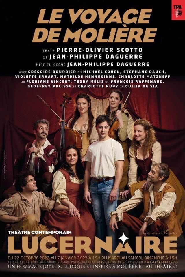 « Le Voyage de Molière » de Jean-Philippe Daguerre et Pierre-Olivier Scotto; mise en scène de Jean-Philippe Daguerre, avec (en alternance) : Geoffrey Palisse, Charlotte Matzneff, Violette Erhart, Charlotte Ruby, Mathilde Hennekine, Stéphane Dauch, Teddy Melis, Gregoire Bourbier, François Raffenaud, Floriane Vincent, Giulia De Sia et Michael Cohen. Au Théâtre Le Lucernaire jusqu’au 7 Janvier 2023; du mardi au samedi à 19h et le dimanche à 16h.