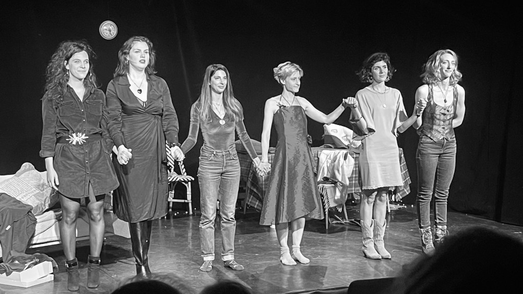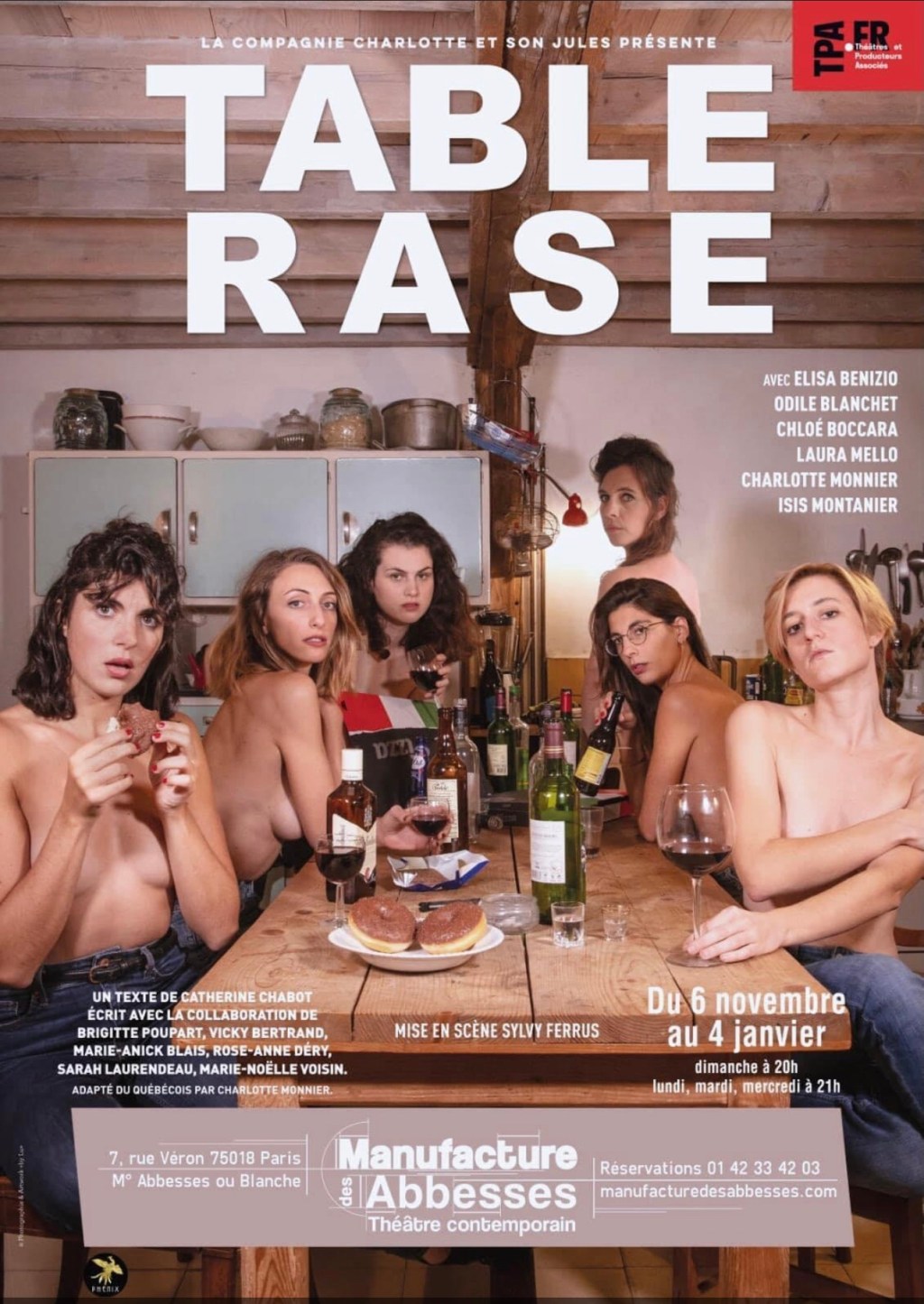 « Table Rase » de Catherine Chabot, adaptation de Charlotte Monnier; mise en scène de Sylvy Ferrus; avec Chloé Boccara, Elisa Benizio, Charlotte Monnier, Isis Montanier, Odile Blanchet et Laura Mello. À La Manufacture des Abbesses jusqu’au 4 Janvier, les dimanches à 20h et du lundi au mercredi à 21h.
