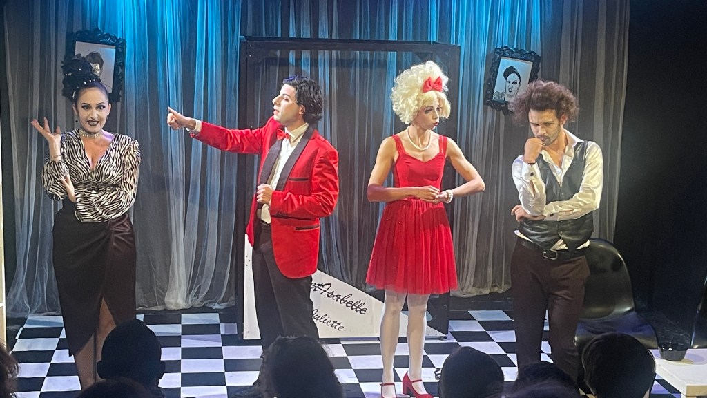 Tout d’abord la mise en scène et la direction d’acteurs d’Olivier Schmidt est absolument à l’opposé du « classique »; totalement décalé, sur un thème assez particulier que s’acheter des amis pour égayer sa monotonie et en faire ce que l’on veut (ce qui peut paraître irréel voire même fantasque); il lui donne justement un décor totalement au delà du réel, avec un couple bourgeois tout en noir et blanc jusqu’au visage et leurs « marionnettes » vêtus et maquillés de rouge, telles des poupées. On reconnaît la patte d’Olivier Schmidt qui dans ses mises en scène, que ce soit sur ses œuvres ou celles d’autres, met de la lumière et de la couleur sur le sombre et le tragique. Car tel est le thème réel que nous envoie cette pièce au visage : pouvons nous vraiment faire tout et n’importe quoi pour égayer sa monotonie; y compris acheter des gens et en faire ce que l’on en veut, de leur parler comme à des objets et les traiter plus bas que terre ? Et un thème comme celui là et sa morale finale (que je ne vous spoilerais pas 🤫), ne peut être traité que sur le ton de la farce et du ridicule.