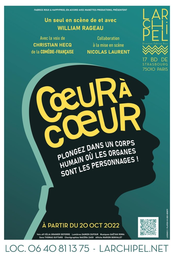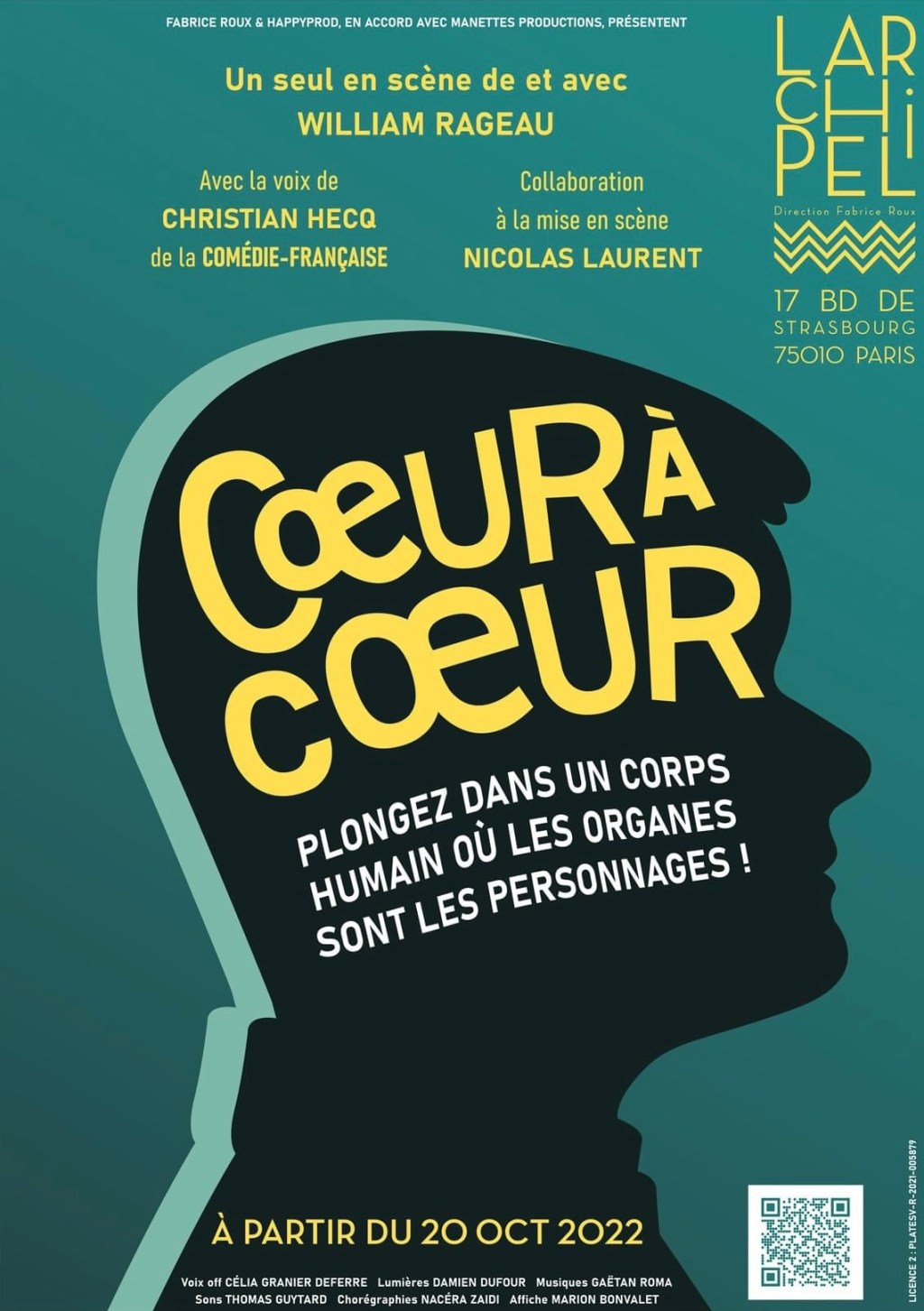 Aujourd’hui je vais vous parler d’un spectacle découvert il y’a quelques jours au Théâtre de L’Archipel. Il s’agit de Coeur à Cœur; écrit et interprété par William Rageau, avec la collaboration de Nicolas Laurent à la mise en scène et les voix de Célia Granier-Deferre et Christian Hecq.