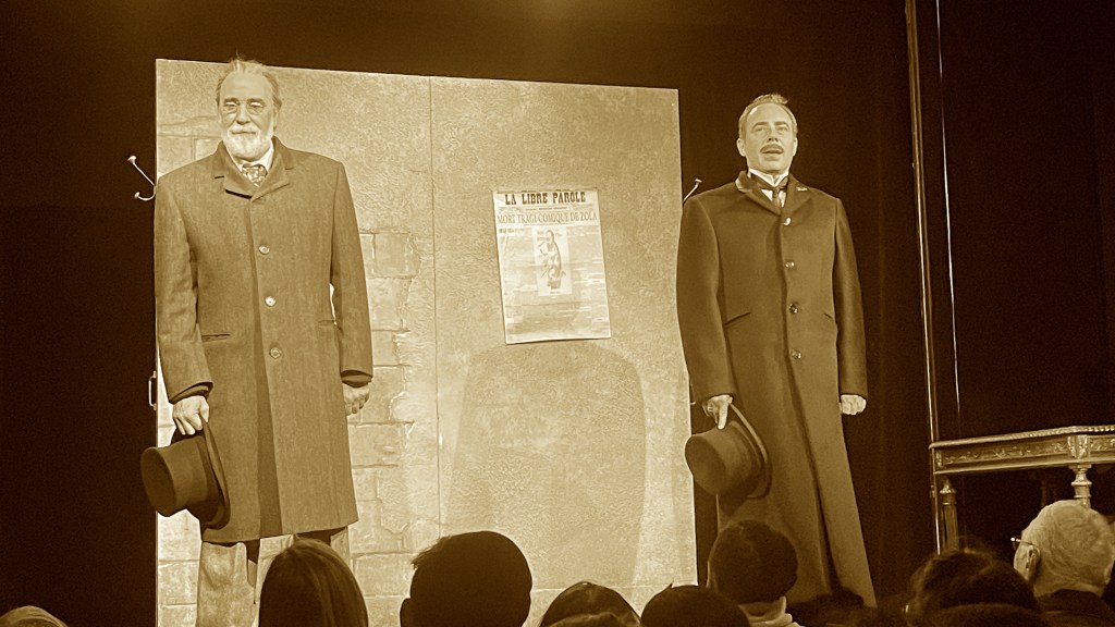 La mise en scène, signée également Didier Caron, est très sobre; faite de panneaux nous entraînant tantôt chez les Daudet, chez Emile Zola, en Angleterre et sur les murs de Paris. Grâce aux idées de Didier; nous voyageons à travers l’Europe et l’Histoire de France. La distribution est tout simplement parfaite; dans le choix comme dans son intensité. Le duo formé par Pierre Azema et Bruno Paviot fonctionne à merveille, on prend un réel plaisir à les voir s’affronter; tout d’abord à coup de saillies humoristiques sur le talent de plume de l’un et la notoriété de l’autre. Mais ensuite ces petits pics deviennent une véritable guerre d’idées et d’idéaux; avec chacun sa vision de l’affaire Dreyfus : violente et sans pitié pour Léon Daudet; humaine et humaniste pour Emile Zola, les deux défendant leur point de vue avec une vraie force et une réelle conviction. Pour interpréter ces deux personnages et donner une vraie vie à leur affrontement; il fallait 2 comédiens mettant toute leur puissance et leur charisme, et pour cela; Pierre et Bruno sont tout ce qu’il y’a de plus parfaits.