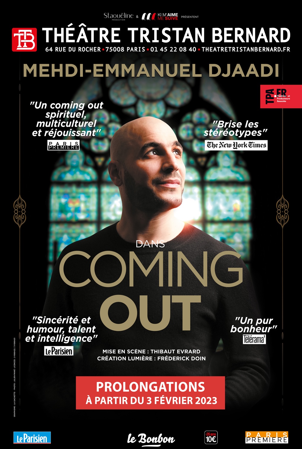 Mehdi-Emmanuel Djaadi dans « Coming-Out »; mise en scène de Thibaut Evrard. Au Théâtre Tristan Bernard à Partir du 3 Février pour 10 dernières représentations, les 3,4,6,9,10,11,16,17 et 18 Février et 6,7 et 8 Mars à 21h.