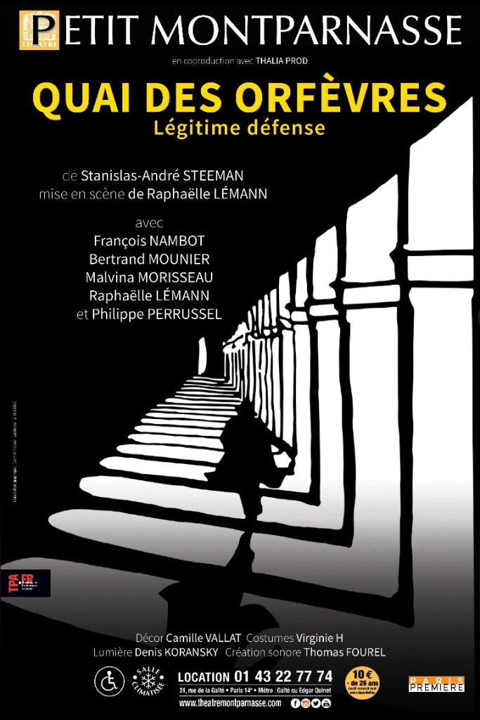 « Quai des Orfèvres : Légitime Défense » de Stanislas-André Steeman, mise en scène de Raphaëlle Lémann; avec François Nambot, Bertrand Mounier, Malvina Morisseau, Raphaëlle Lémann et Philippe Perrussel. Au Théâtre du Petit Montparnasse; du mardi au samedi à 19h et le dimanche à 17h.