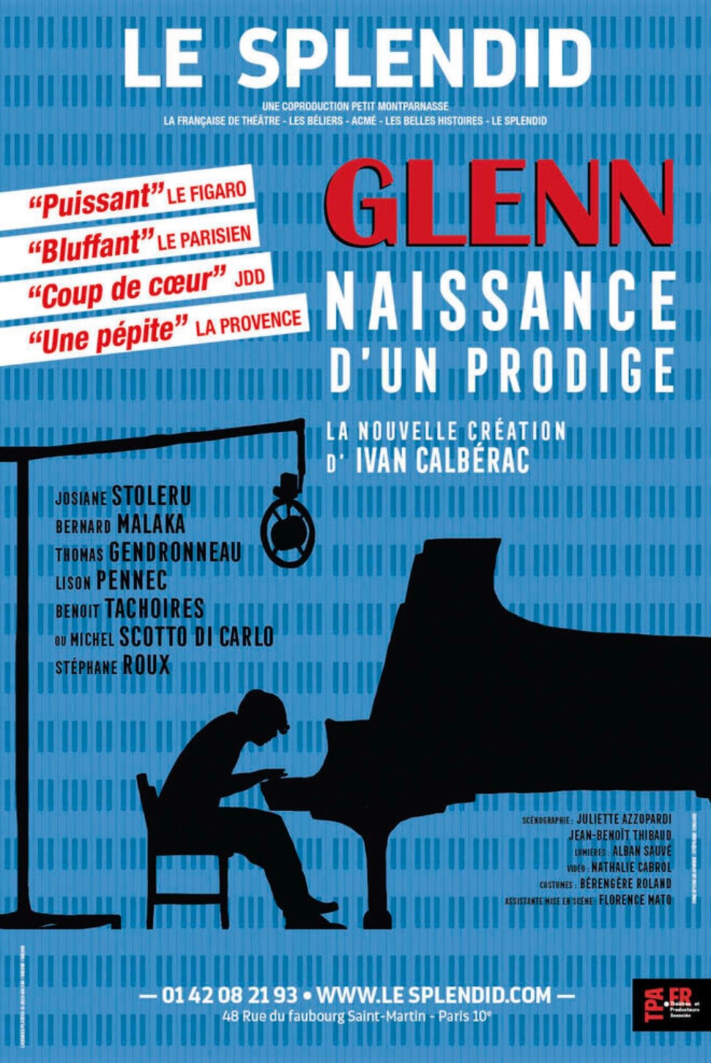 Aujourd’hui je vais vous parler d’un spectacle qui après son succès au Théâtre du Petit Montparnasse, a posé ses valises (et son piano) au Splendid. Il s’agit de Glenn, Naissance d’un Prodige; une pièce écrite et mise en scène par Ivan Calberac, avec Thomas Gendronneau, Josiane Stoleru, Bernard Malaka, Lison Pennec, Benoît Tachoires et Michel Scotto Di Carlo (en alternance) et Stéphane Roux.