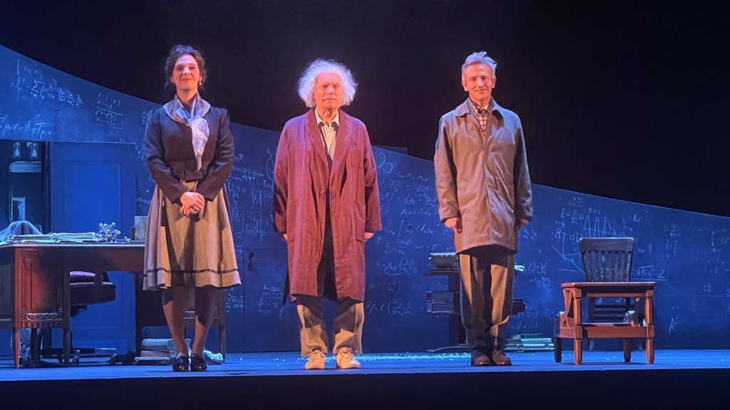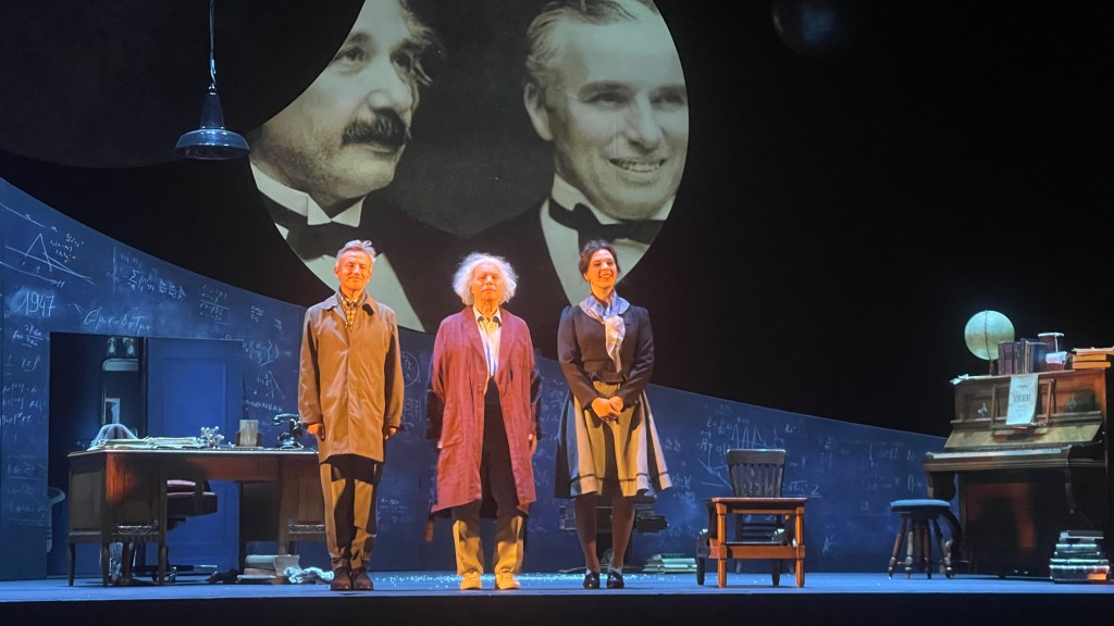 On ne peut que saluer la performance des trois comédiens qui donnent ou redonnent vie aux trois protagonistes de ces rencontres. Même s’ils ne ressemblent ni à Einstein ni à Chaplin; Daniel Russo et Jean-Pierre Lorit nous offrent deux belles versions de ces deux géants. Par un tignasse de cheveux blancs hirsutes et décoiffés et une moustache tout aussi blanche et bine fournie; Daniel Russo nous offre un attendrissant Albert, vieillissant et un peu perdu dans sa tête depuis la disparition de sa femme, allant jusqu’à mélanger les films de Chaplin avec ceux des autres grands noms du cinéma de la même époque; mais gardant de sa lucidité et de sa conviction pour défendre ses opinions et ses idéaux. Jean-Pierre Lorit s’amuse et met toute sa verve et sa passion au service de Charlie; prêt à défendre l’idée inconcevable de son prochain film, tout en amusant Hélène qui est fan de lui et en disant ce qu’il pense de la Bombe à Albert; et en s’inquiétant sur l’avenir à cause de cet exil subit et sur la santé de son ami. Elisa Benizio apporte beaucoup de douceur, de lumière, d’humour et de vie au personnage d’Hélène, la gouvernante d’Albert qui voue une telle admiration à Charlie. Elle sera non pas l’arbitre qui va donner tort ou raison à l’un ou à l’autre; mais plutôt celle qui remet un peu les pieds sur terre (à coup de citronnade) à ces deux génies tutoyant les étoiles; car, bien qu’ils soient des sommités dans leurs domaines respectives, ils sont avant tout des hommes qui s’admirent mutuellement et qui doutent en permanence; que ce soit de l’Homme ou d’eux-mêmes.