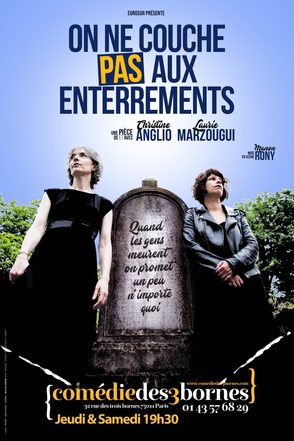 Aujourd’hui je vais vous parler d’un spectacle découvert il y’a quelques jours à La Comédie des 3 Bornes. Il s’agit de la pièce On Ne Couche Pas Aux Enterrements; une pièce écrite et interprétée par Christine Anglio et Laurie Marzougui, dans une mise en scène signée Manon Rony.