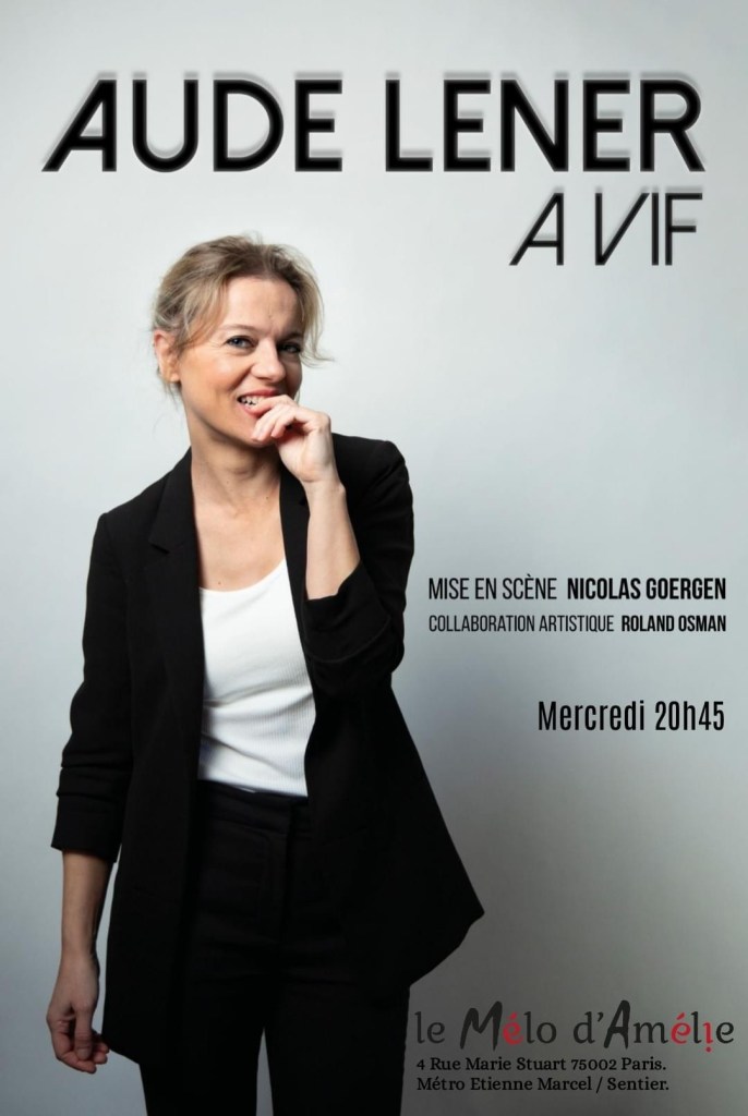 « Aude Lener : À Vif »; écrit et interprété par Aude Lener; mise en scène de Nicolas Goergen. Au Mélo d’Amélie jusqu’au 26 Avril, le mercredi à 20h45; et à Avignon au Théâtre de L’Optimist, du 7 au 29 Juillet à 21h30.