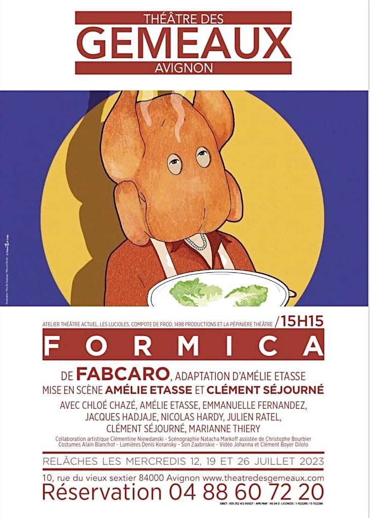 « Formica » d’après la bande dessinée de Fabcaro, adaptation d’Amélie Étasse; mise en scène de Clément Séjourné et Amélie Étasse; avec Chloé Chazé, Amélie Étasse, Emmanuelle Fernandez , Jacques Hadjaje, Nicolas Hardy, Julien Ratel, Clément Séjourné et Marianne Thiery. Au Théâtre des Gémeaux jusqu’au 29 Juillet à 15h15 (relâche les mercredis).
