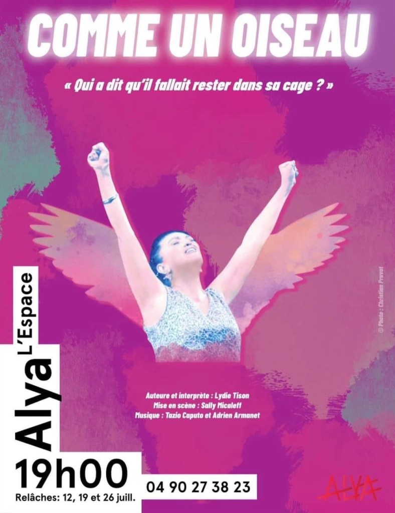 « Comme un Oiseau » de Lydie Tison; mise en scène de Sally Micaleff, avec Lydie Tison. À L’Espace Alya jusqu’au 28 Juillet à 19h (relâche les mercredis).