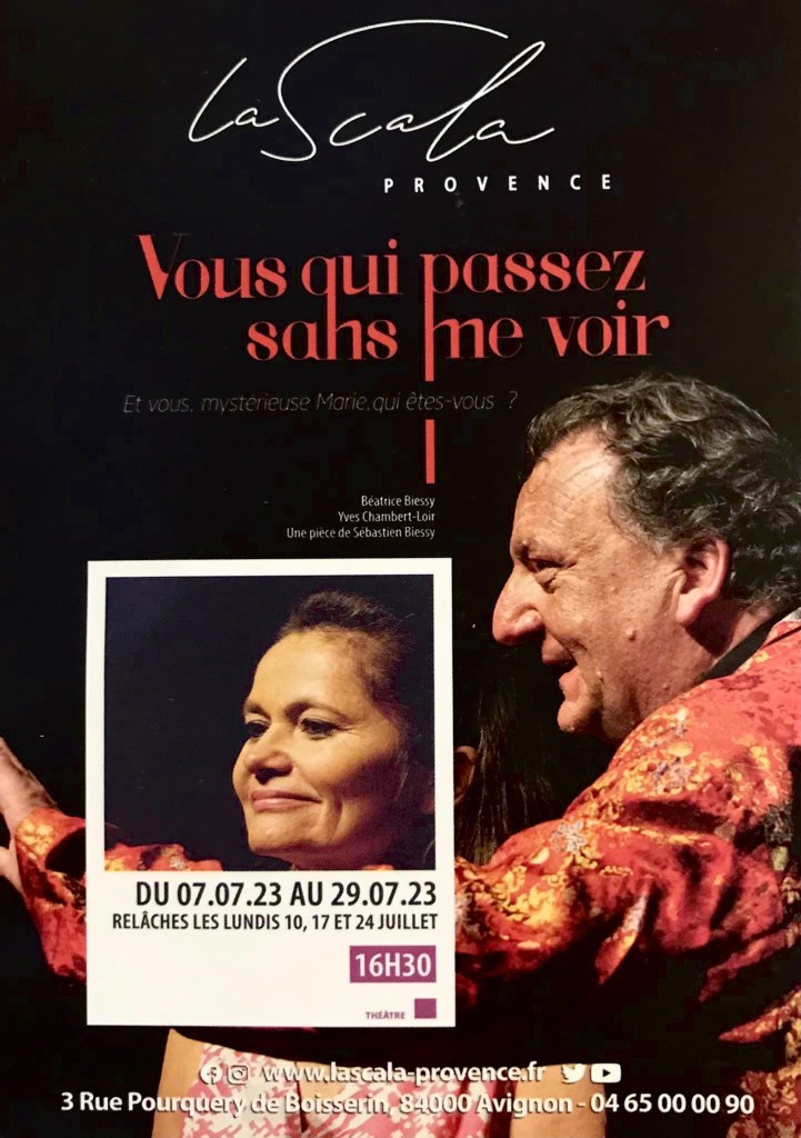 Toujours en direct d’Avignon pour vous parler de spectacles de jouant durant Le Off; je vais vous parler aujourd’hui d’une pièce découverte du côté de La Scala Provence. Il s’agit de Vous Qui Passez Sans Me Voir, une pièce écrite et mise en scène par Sébastien Biessy; interprétée par Béatrice Biesssy et Yves Chambert-Loir.
