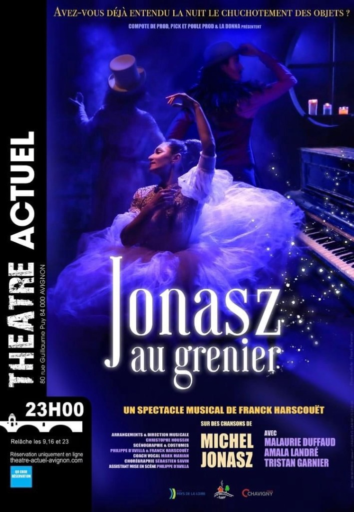 Sous Le Soleil Avignonnais, vous avez aussi la possibilité de découvrir plusieurs spectacles musicaux. Et là; je vais vous parler de Jonasz au Grenier, un spectacle écrit et mis en scène par Franck Harscouët (avec l’assistance de Philippe d’Avilla); avec Malaurie Duffaud, Amara Landré et Tristan Garnier.