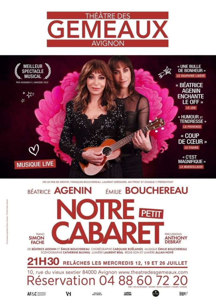 « Notre Petit Cabaret » de Béatrice Agenin et Emilie Bouchereau; accompagnement musicaux de Simon Fache et Anthony Debray. Au Théâtre des Gémeaux jusqu’au 29 Juillet à 21h30 (relâche le 26 Juillet).