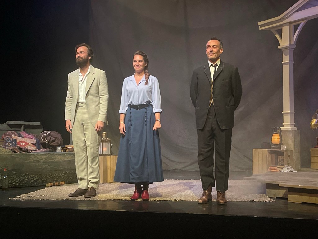 Du côté de la distribution, elle nous offre un instant de théâtre fort et brillant. Benoît Soles, en plus d’être un auteur de talent, est aussi un comédien épatant . Il incarne ici un homme blessé et meurtri de l’intérieur comme en dehors, prêt à tout pour sauver celui qui lui a permis de survivre; quitte à aller lui-même dans la maison (et la gueule) du loup. Amaury De Crayencour nous prouve dans cette Maison Du Loup qu’il est encore une fois un comédien hors pair pourvu d’un immense talent en campant ici un Jack London en panne d’inspiration, se noyant dans l’alcool et voyant d’un très mauvais œil la venue de ce « chien fou » sur son domaine. Anne Plantey est une parfaite Charmian, « Partenaire » en tout point de Jack London, prête à tout pour lui faire retrouver l’inspiration, quitte à acheter les droits d’un article pour l’inspirer. Mais la venue d’Ed et cette nuit à la Maison du Loup ne sera pas sans conséquences sur sa relation avec Jack; qui après cette nuit sortira l’un de ses plus beaux roman : Le Vagabond Des Étoiles.