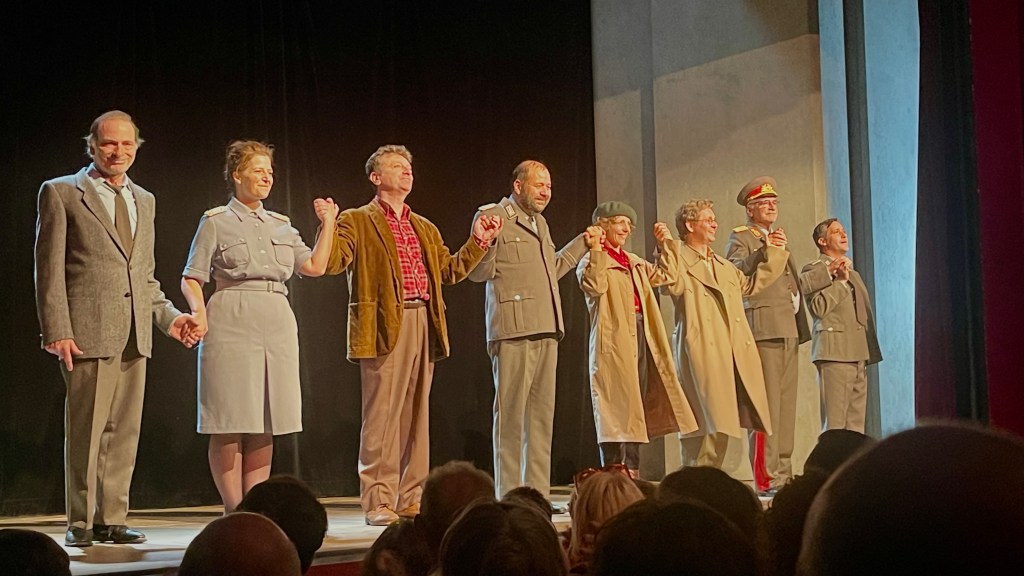 Dans une mise en scène belle et réussie signée José Paul; déambulent une pléiade d’excellents comédiens. Patrick Haudecoeur est un parfait Ludwig; amoureux maladroit prêt à tout par amour et par liberté , y compris se jeter dans la gueule du loup pour passer à l’ouest avec sa bien aimée; interprétée par l’excellente Caroline Maillard, elle-même également prête à tout pour sa liberté; comme jouer au jeu de la séduction avec un agent de la Stasi. Guillaume Bouchède est très drôle et touchant dans ce personnage de la Stasi, de base très dur mais qui devient tout doux au contact de cette charmante infirmière; pas si douce et innocente qu’il ne l’imagine. Michel Lerousseau est un parfait médecin/espion prêt à tout pour réussir sa mission, quitte à se servir de ce couple prêt à tout pour leur liberté; Raïssa Mariotti s’amuse autant qu’elle nous amuse dans le rôle de Birgit, la femme de Werner également membre de la Stasi, d’une froideur implacable y compris envers son mari mais le cœur sur la main pour redonner le sourire à son supérieur dépressif. Guilhem Pellegrin est très drôle dans ce personnage de colonel en pleine dépression par le départ de son être aimé, au point de ne plus avoir le cœur à « l’interrogatoire »; Gino Lazzerini et Claude Guyonnet complètent avec brio cette équipe en alternant des personnages gravitant autour de cette tentative d’évasion pour la liberté devenant au fil du temps une véritable parodie des plus grands films d’espionnage.