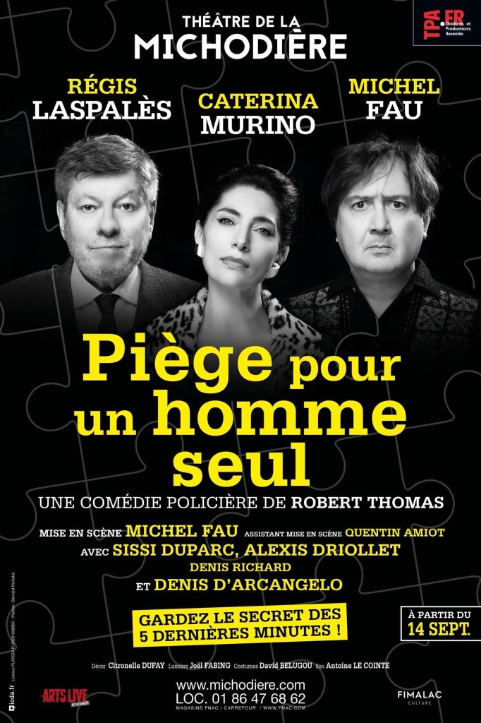 « Piège Pour Un Homme Seul » de Robert Thomas, mise en scène de Michel Fau; avec Caterina Murino, Michel Fau, Régis Laspalès, Alexis Driollet, Sissi Duparc, Denis D’Arcangelo et Denis Richard. Au Théâtre de La Michodière jusqu’au 30 Décembre, du mardi au samedi à 20h + le samedi à 16h et le dimanche à 15h30 (relâche les dimanches 24 et 31 Décembre).