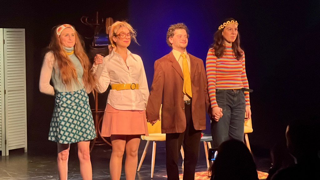 La distribution se prend à merveille au jeu de cette comédie sur la société de l’époque. Céline Larmoyer, Angelina Colombani, Mathilde Serre et Edouard Sibé, jeunes comédiens absolument brillants et talentueux, s’amusent dans ces 4 personnages aux personnalités et aux caractères très opposés; mais qui vont réussir, tant bien que mal, à cohabiter. On rit de leurs tenues, de leurs échanges, de leur susceptibilité et de leurs coups bas dans cette bataille pour le retour de la paix et du calme dans cette appartement de copines. Céline Larmoyer est une pétillante Betty au caractère bien affirmée; mariée 4 fois et ayant décidé de vivre comme elle le souhaite et pas comme ses maris le voulaient; Angelina Colombani est très drôle dans le personnage de Véra, libre et sans filtre, prête à tout pour guérir Bruno pour retrouver la tranquillité et le calme de leur vie à 3; Mathilde Serre est excellente dans le rôle de Simone, l’opposée totale de caractère de ces 3 copines. Mariée et veuve, elle se sent retrouvée de la liberté auprès de Betty et Véra; mais va avoir un petit relent de femme au foyer au contact de Bruno, qui ne se gênera pas pour en profiter. Édouard Sibé, parfait chien dans ce jeu de quille féminin, est très bon dans le rôle de Bruno, voisin abandonné et désespéré, adopté par ses voisines avec lesquelles il prendra un peu trop ses aises; quitte à provoquer une scission parmi les 3 Gamines…