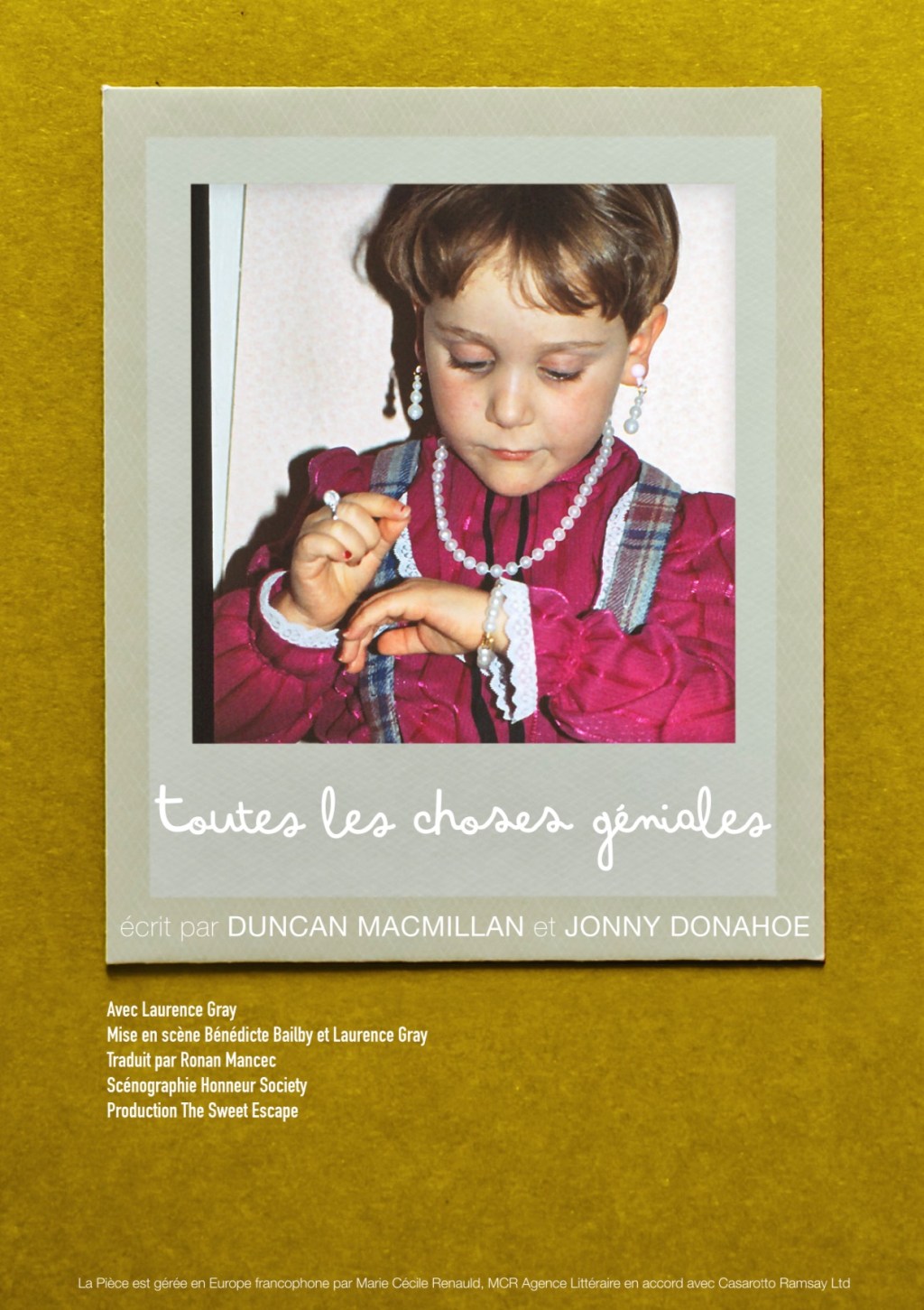 Aujourd’hui je vais vous parler d’une pièce découverte lors de représentations exceptionnelles au Lavoir Moderne Parisien. Il s’agit de Toutes Les Choses Géniales de Duncan Macmillan et Johnny Donahoe traduit par Ronan Mancec; mise en scène de Benedicte Bailby et Laurence Gray, avec Laurence Gray.