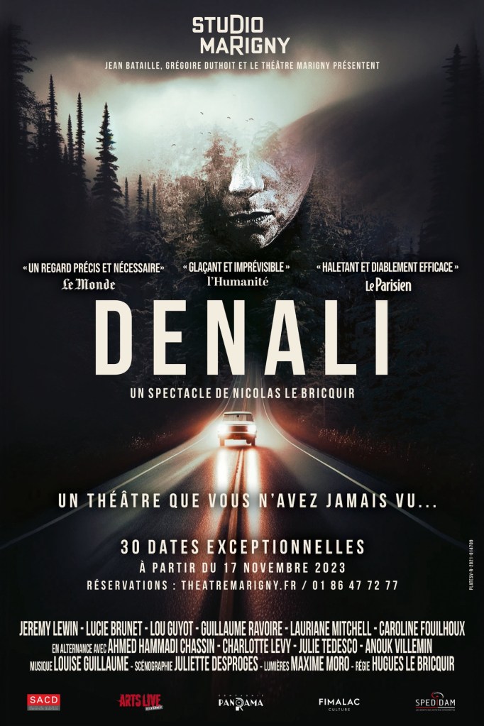 « Denali » de Nicolas Le Bricquir; mise en scène de l’auteur, musiques de Louise Guillaume; avec (en alternance) Lucie Brunet, Jérémy Lewin, Lou Guyot, Guillaume Ravoire, Caroline Fouilhoux, Lauriane Mitchell, Ahmed Hammadi Chassin, Anouk Villemin, Julie Tedesco et Charlotte Levy. Au Studio Marigny jusqu’au 31 Décembre; du mercredi au samedi à 20h30 et le dimanche à 16h (relâche le 24 Décembre).