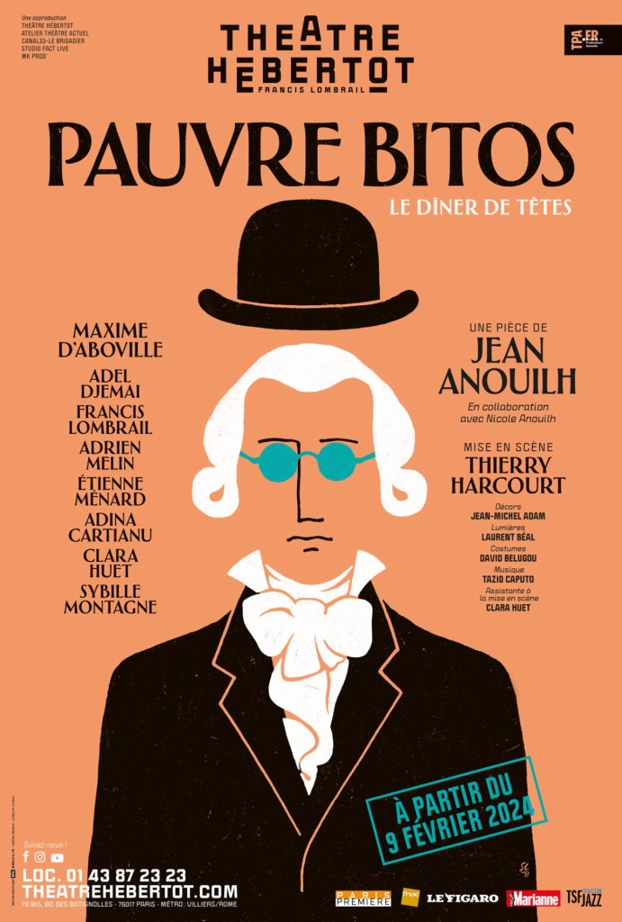 « Pauvre Bitos Ou Le Dîner de Têtes » de Jean Anouilh, mise en scène de Thierry Harcourt; avec Maxime D’Aboville, Adrien Melin, Étienne Ménard, Clara Huet (en alternance avec Adina Cartianu), Francis Lombrail, Sybille Montagne et Adel Djemai. Au Théâtre Hébertot du mercredi au samedi à 19h, les dimanches à 17h30 + représentations exceptionnelles les mardis 19 Mars et 2 Avril à 19h; jusqu’au 5 Mai.