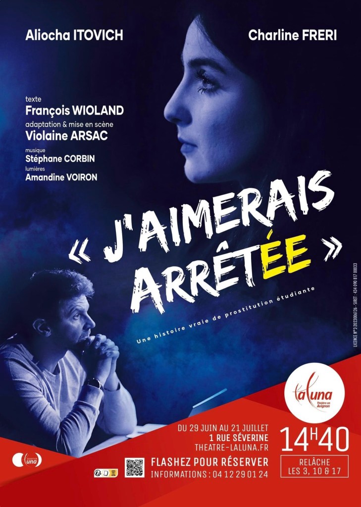 Dans la continuité des découvertes avignonnaises; je vais vous parler de J’Aimerais Arrêtée; un texte de François Wioland, adapté et mis en scène par Violaine Arsac; et interprété par Charline Freri et Aliocha Itovich.