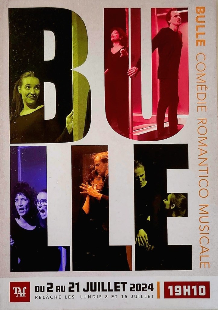 « Bulle » de Stéphane Titeca, mis en en scène de l’auteur; avec Dorothée Leveau, Agathe Sanchez et Agathe Sanchez, Dorothée Leveau et Anthony Alborghetti. À L’Atelier Florentin jusqu’au 21 Juillet à 19h10 (relâche le 15 Juillet.
