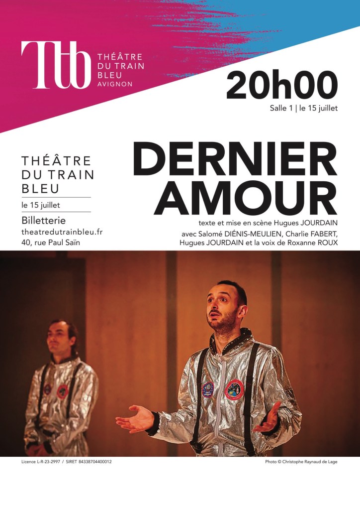 Dernier Amour, écrit et mis en scène par Hugues Jourdain, musiques de Samuel Hecker, Lumières de Coralie Pacreau, Création Vidéo de Manon Sabatier; avec Salomé Diénis Meulien, Charlie Fabert, Hugues Jourdain et la participation vocale de Roxanne Roux.