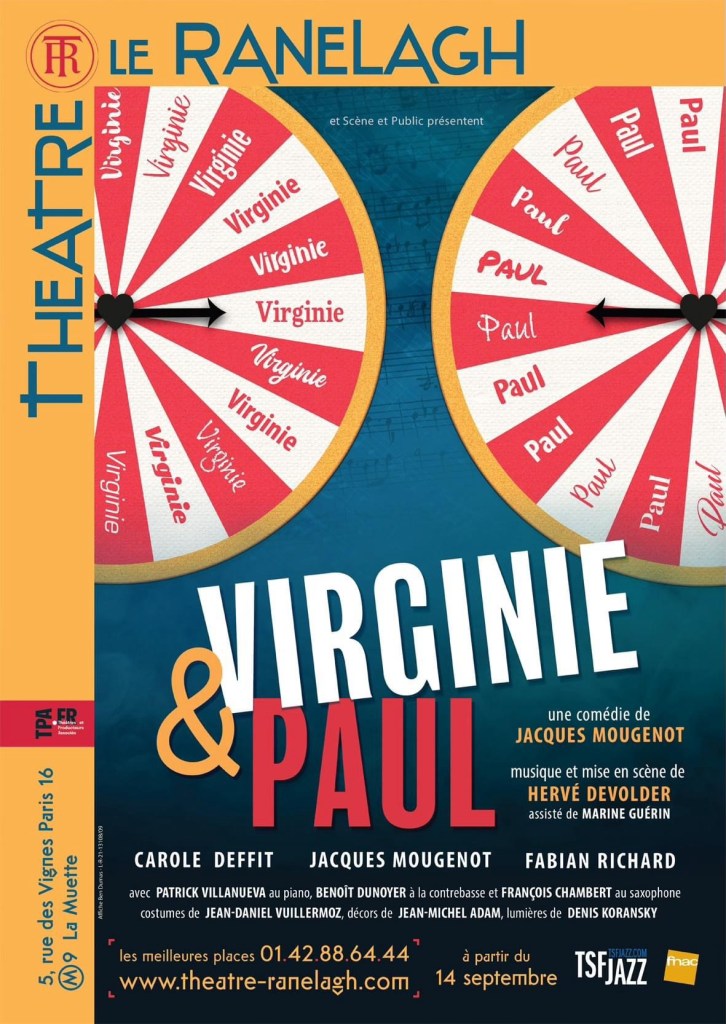 « Virginie & Paul » de Jacques Mougenot, mise en scène et en musique par Hervé Devolder, avec Carole Deffit, Fabian Richard, Jacques Mougenot, Patrick Villanueva (piano), Benoit Dunoyer (contrebasse) et François Chambert (saxophone). Au Théâtre Le Ranelagh jusqu’au 17 Novembre; du jeudi au samedi à 20h30 + dimanche à 17h (relâche le 15 Novembre).