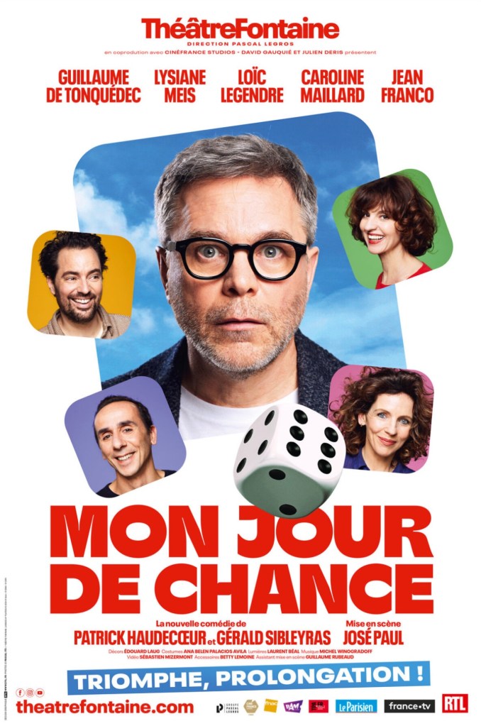 « Mon Jour de Chance » de Patrick Haudecœur et Gérald Sibleyras; mise en scène de José Paul, avec Guillaume de Tonquedec, Caroline Maillard, Jean Franco, Lysiane Meis et Loïc Legendre. Au Théâtre Fontaine jusqu’au 18 Mai 2025; du Mardi au Jeudi à 20h30, les Vendredis et Samedis à 21h + Les Samedis à 16h30 et Dimanches à 16h.