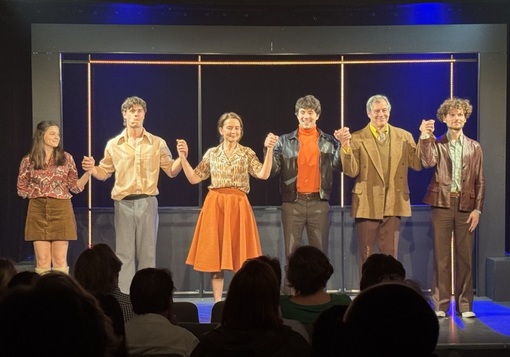 La distribution vue ce soir là, composée de Mathilde Cerf, Cécile Covès, Jean-Philippe Bêche, Marc Tourneboeuf, Lancelot Courcieras et Nathan Robain (brillant créateur musical et sonore du spectacle qu’il joue en live durant toute la durée de la pièce), me dévoila une alchimie de comédien(ne)s courrait partout et se donnant à 200% dans les interprétations d’une trentaine de personnages d’âge et de rang aux antipodes les uns des autres. Coup de chapeau à Jean-Philippe Bêche et à Cécile Covès qui doivent changer de tenue et de personnage au moins toutes les 2 à 5 minutes; mais le trio de jeunes enquêteurs est tout aussi drôle et excellents dans leurs personnages : Mathilde Cerf est parfaite en Alaïa, jeune élève au vocabulaire très avancé pour son âge et férue d’aventures (une Hermione Granger des années 60); Marc Tourneboeuf est très bon dans son personnage d’Arthur, jeune poète amoureux préférant retrouver sa belle plutôt que de travailler avec ses camarades; et Lancelot Courcieras excelle dans son personnage d’Averell, personnage moins bêta que son homonyme de BD mais presque aussi maladroit et surtout fonceur pour aboutir à ses fins; entraînant ses camarades avec lui.
