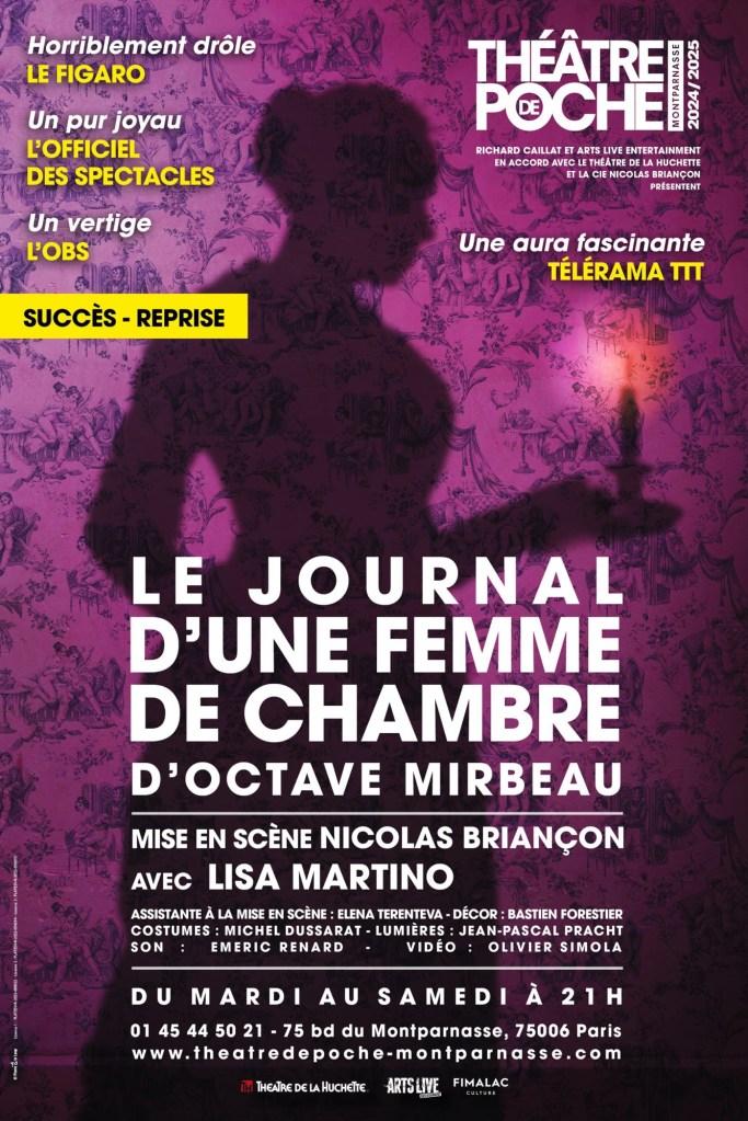 « Le Journal d’Une Femme de Chambre » d’Octave Mirbeau; mise en scène de Nicolas Briançon, avec Lisa Martino. Au Théâtre de Poche Montparnasse jusqu’au 12 Juillet; du mardi au samedi à 21h.