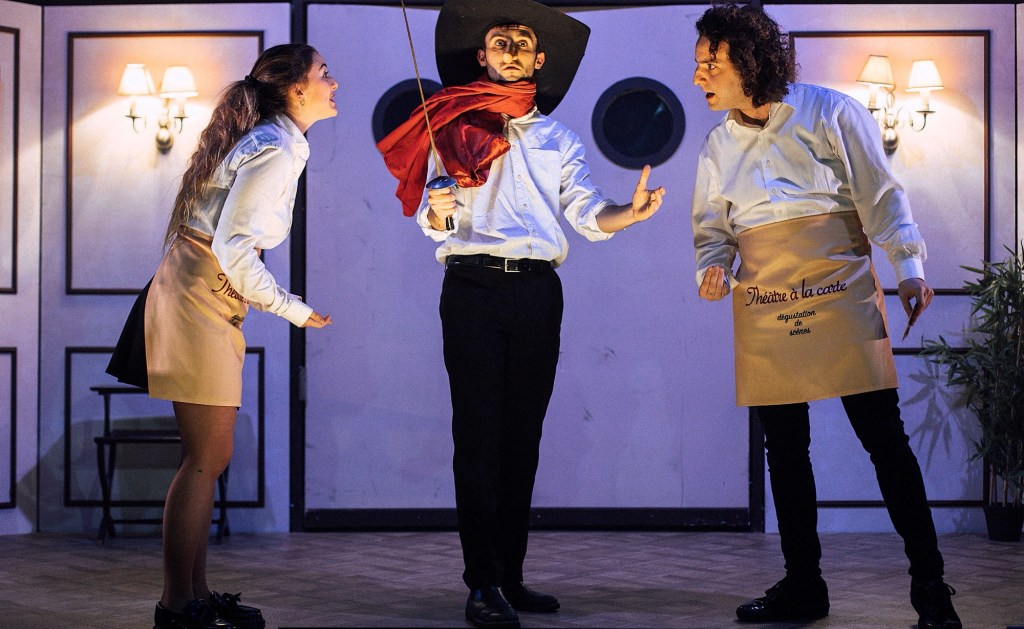 L’Histoire (pour ainsi dire…) : Nous sommes accueillis dans la cour par des comédiens-serveurs qui proposent de nous installer à nos « tables » dans les gradins. Buvette avec vin rouge, musicien violoniste, c’est visiblement parti pour un repas dans un restaurant gastronomique. Mais la carte l’indique, avec la suggestion du jour (le soir de ma venue, Les Fourberies de Scapin) : c’est un menu théâtral que nous allons déguster. Menu enfant, puis entrée sur le thème de l’amour, plat de résistance autour du conflit… Le concept mêlant gastronomie et théâtre sera décliné tout le long de cette 1h10, jusqu’aux jeux de mots fameux des divers intermèdes. Et c’est très loin d’être un four…