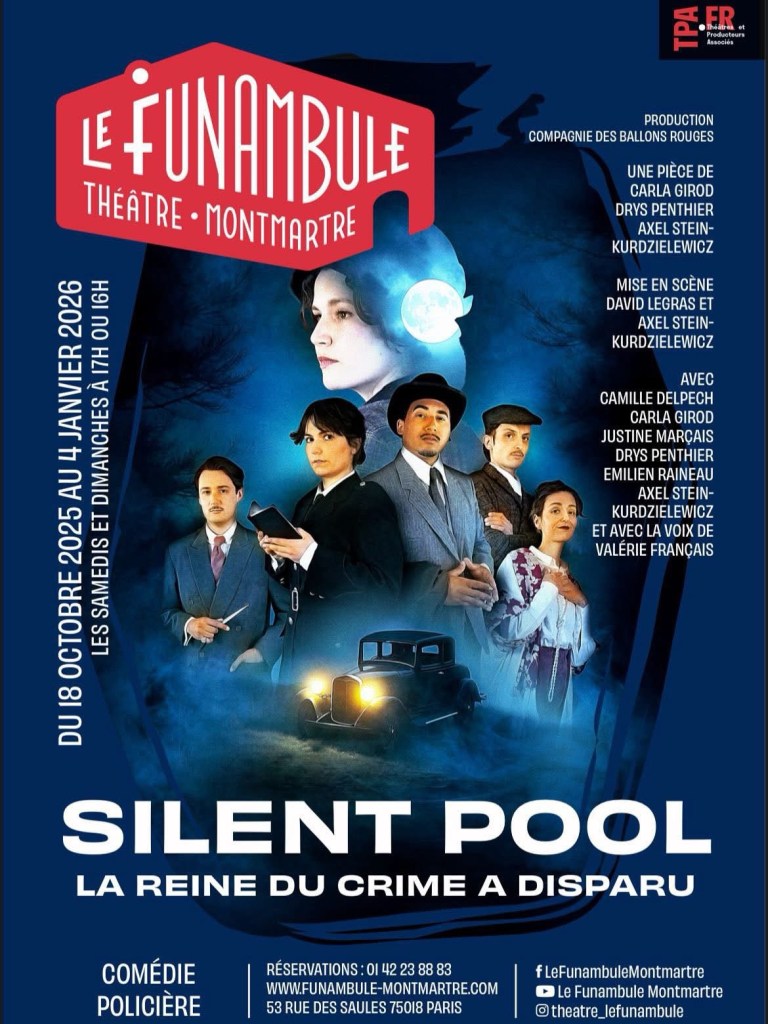 « Silent Pool » de Carla Girod, Axel Stein-Kurdzielewicz et Drys Penthier; mise en scène de David Legras et Axel Stein-Kurdzielewicz, Costumes de Jérôme Ragon, Musiques de Laurent Labruyère, voix Off de Valérie Français; avec Camille Delpech, Justine Marçais, Carla Girod, Drys Penthier, Émilien Raineau et Axel Stein-Kurdzielewicz. Au Funambule Montmartre jusqu’au 4 Janvier, les samedis à 17h et les dimanches à 16h + Représentation Exceptionnelle le mercredi 31 Décembre à 17h.