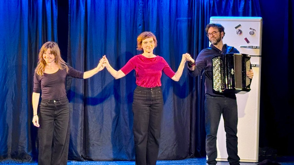 « Les Vaches Laitières Ont Aussi de Beaux Yeux » d’Aurelie Bargème; mise en scène de Didier Brice, Musiques de Maxime Perrin, Chorégraphie de Cécile Bon; avec Marie Petiot, Aurélie Bargème et Maxime Perrin. Au Théâtre Le Funambule Montmartre jusqu’au 29 Avril; les mardis et mercredis à 19h ou 21h.